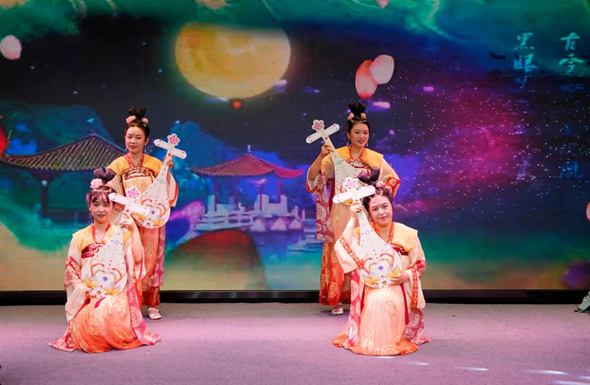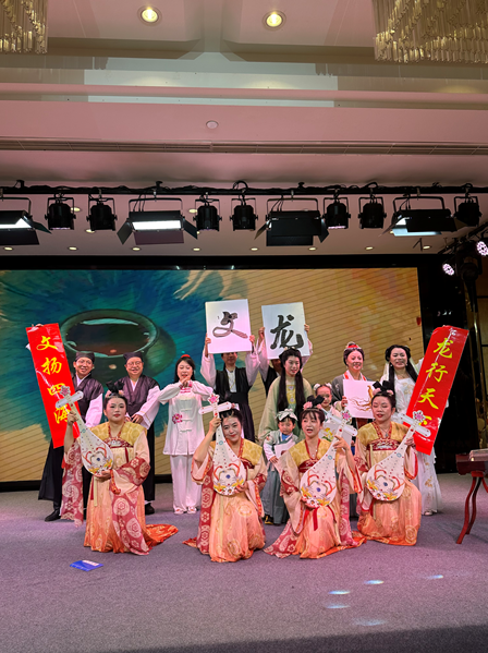 随着悦耳的背景音乐缓缓奏响,一位雍容华贵的妇人手牵两个书童徐徐上场,声情并茂的齐声诵读中国古诗词。四位身着华美绚丽的衣裙、手持枇杷的仙女随即鱼贯而出。她们时而轻抚琴弦,低吟浅唱,时而舒展双臂,翩翩起舞。云裙霞衣,婀娜多姿,美不胜收。她们的舞姿优美而灵动,如风中摇曳的柳絮,如翩翩起舞的蝴蝶,每一个转身、每一次移位都充满了诗情画意,似乎在诉说着昔日古丝绸之路的繁华。紧接着,四才子下棋对弈、泼墨疾书,巾帼女侠弹跳腾挪,尽显中国传统艺术的精华,舞台化的表现形式轮番上演,让人目不暇接,连连叫好。有趣的是,4岁的小小书童被下棋的叔叔吸引住了,竟然自己跑过去兴致勃勃的旁观,他的童真引来大家一片愉悦的欢笑声。斗转星移,妇人带着两个小书童向神采奕奕的私塾先生鞠躬行礼,并随之习文识字,展望未来。最后,所有演员高声齐唱主题曲《龙文》,并恭祝大家新春快乐,龙行天下,文扬四海。场下,如潮的掌声雷动。