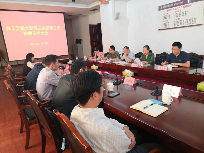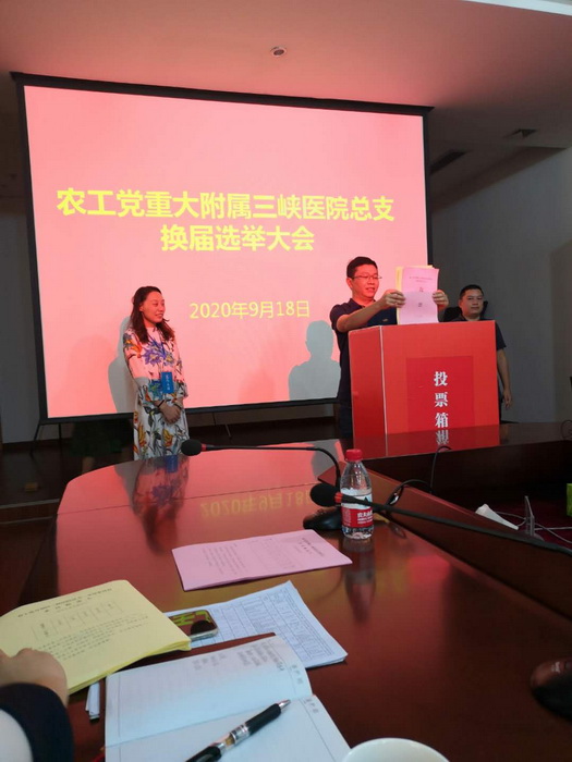 2020年9月18日,农工党重大附属三峡医院总支换届选举大会在医院三德厅召开,成功选举产生第四届总支委员会。中共万州区委统战部副部长程万青、重大附属三峡医院党委委员赵明祥、党办副主任赵永明出席会议,农工党万州区委会副主委李旭宏、骆坤明、陈贵林到会指导。会议由总支副主委邓超主持。